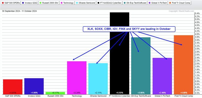 First notice that the Technology SPDR (XLK) and five tech-related ETFs are leading in October (semis, cybersecurity, software, fintech and cloud). They are up 2% or more and easily outperforming the major index ETFs (SPY,QQQ,IWM). The tech ETFs underperformed in July-August and are now getting their mojo back.