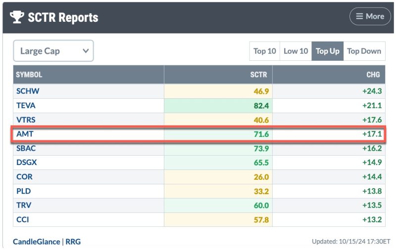 FIGURE 1. SCTR REPORT FOR OCTOBER 15, 2024. American Tower (AMT) was in the top 5 in the Large Cap Top Up category.Image source: StockCharts.com. For educational purposes.