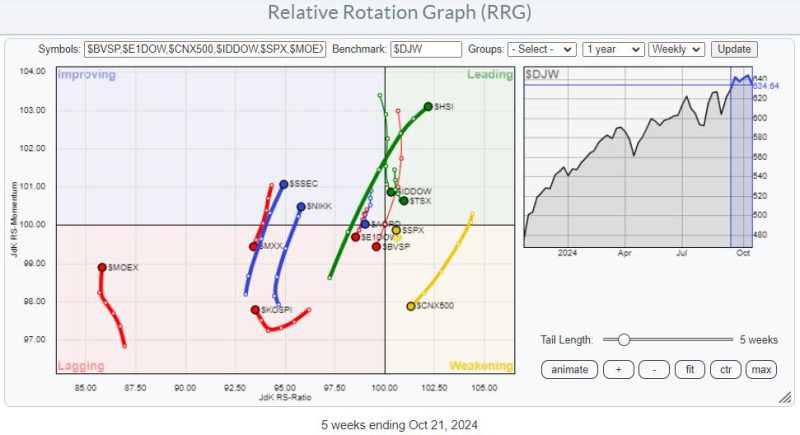 The S&P 500 ($SPX) is positioned very close to the center of the chart, hugging the benchmark. This proximity is expected, given that the US constitutes a hefty portion of the Dow Jones Global Index. However, the S&P 500 is also depicted with a short tail within the weakening quadrant, indicating a renewed up-move within the already rising relative trend.