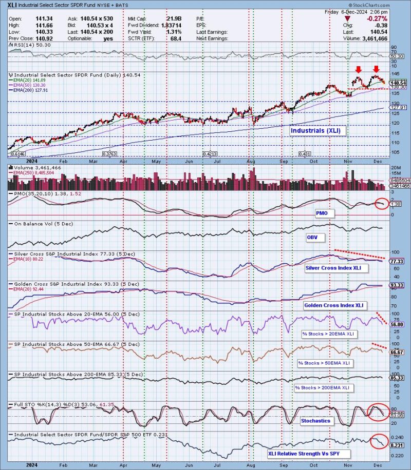 To add insult to injury, on Thursday, XLI saw a Price Momentum Oscillator (PMO) Crossover SELL Signal. Participation has been sinking since the last top and, while percentages of stocks above key moving averages are above our bullish 50% threshold, the sector is clearly breaking down while the SPY makes new all-time highs.