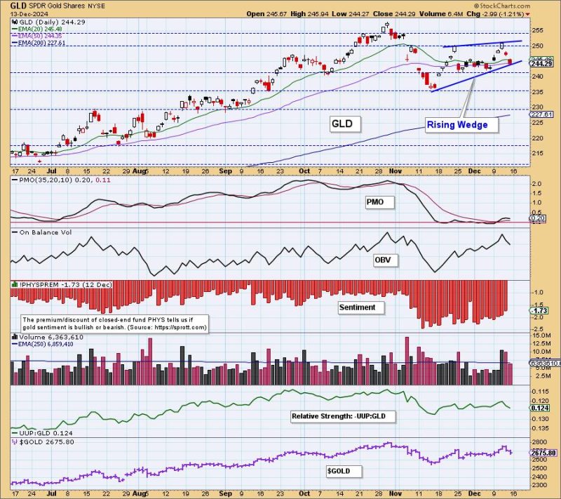 The weekly chart shows the root of the problem, which is the parabolic advance (+71%) from the 2022 low. Parabolic advances beg for correction, which can sometimes be severe. In the case of GLD, we do not expect more than a sideways digestion process to dampen the angle of ascent.
