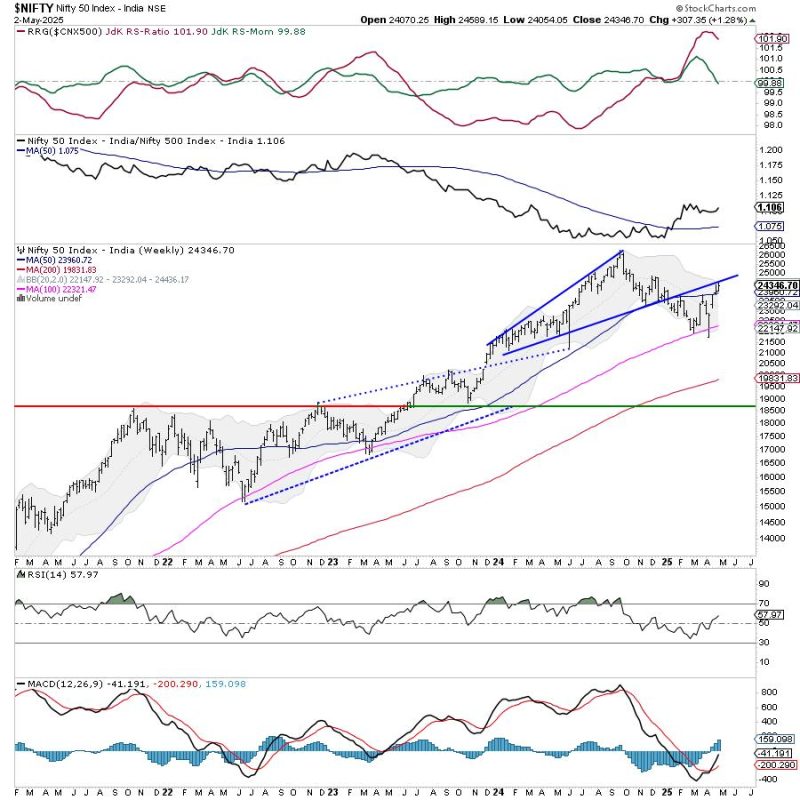 The pattern analysis shows that on the daily chart, the Nifty crossed above the 200-DMA a few days ago; now, it is consolidating just above this important level. It has penetrated the 50-week MA placed at 23962, and this level is now expected to act as support in the event of any corrective retracement. Importantly, the Nifty has resisted the rising trendline pattern resistance near 24600. This trendline begins at 21130 levels and joins the subsequent rising bottoms.
