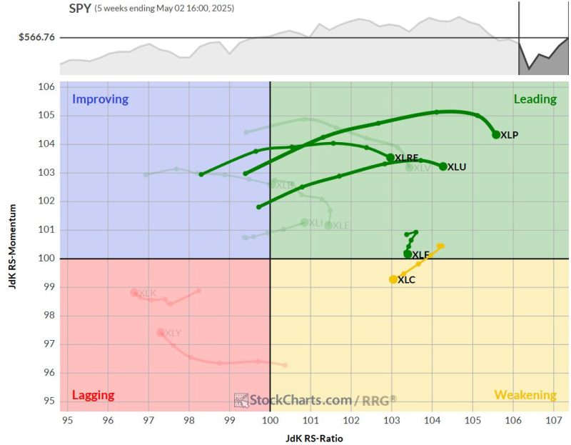 Staples, utilities, real estate, and financials are all positioned in the weakening quadrant, traveling on negative RRG headings.